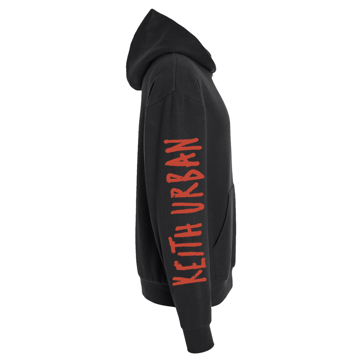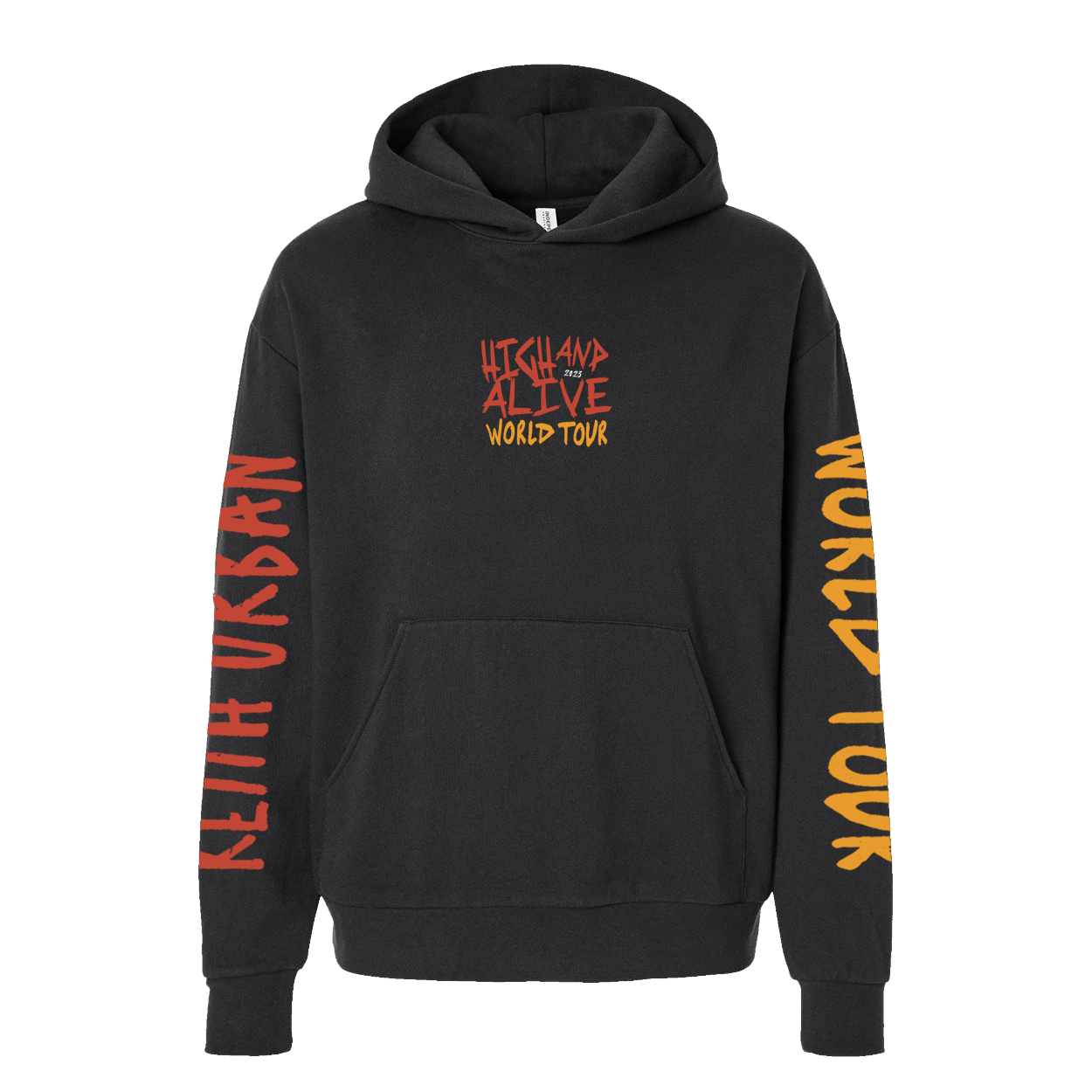 - Black, oversized hoodie featuring "HIGH AND ALIVE WORLD TOUR 2025" on the front, a live image of Keith and HIGH AND ALIVE WORLD TOUR 2025 cities on the back, "KEITH URBAN" on the right sleeve, and "WORLD TOUR" on the left sleeve.