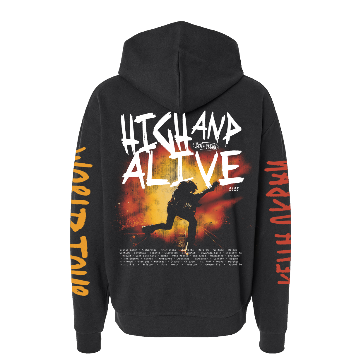 - Black, oversized hoodie featuring "HIGH AND ALIVE WORLD TOUR 2025" on the front, a live image of Keith and HIGH AND ALIVE WORLD TOUR 2025 cities on the back, "KEITH URBAN" on the right sleeve, and "WORLD TOUR" on the left sleeve.