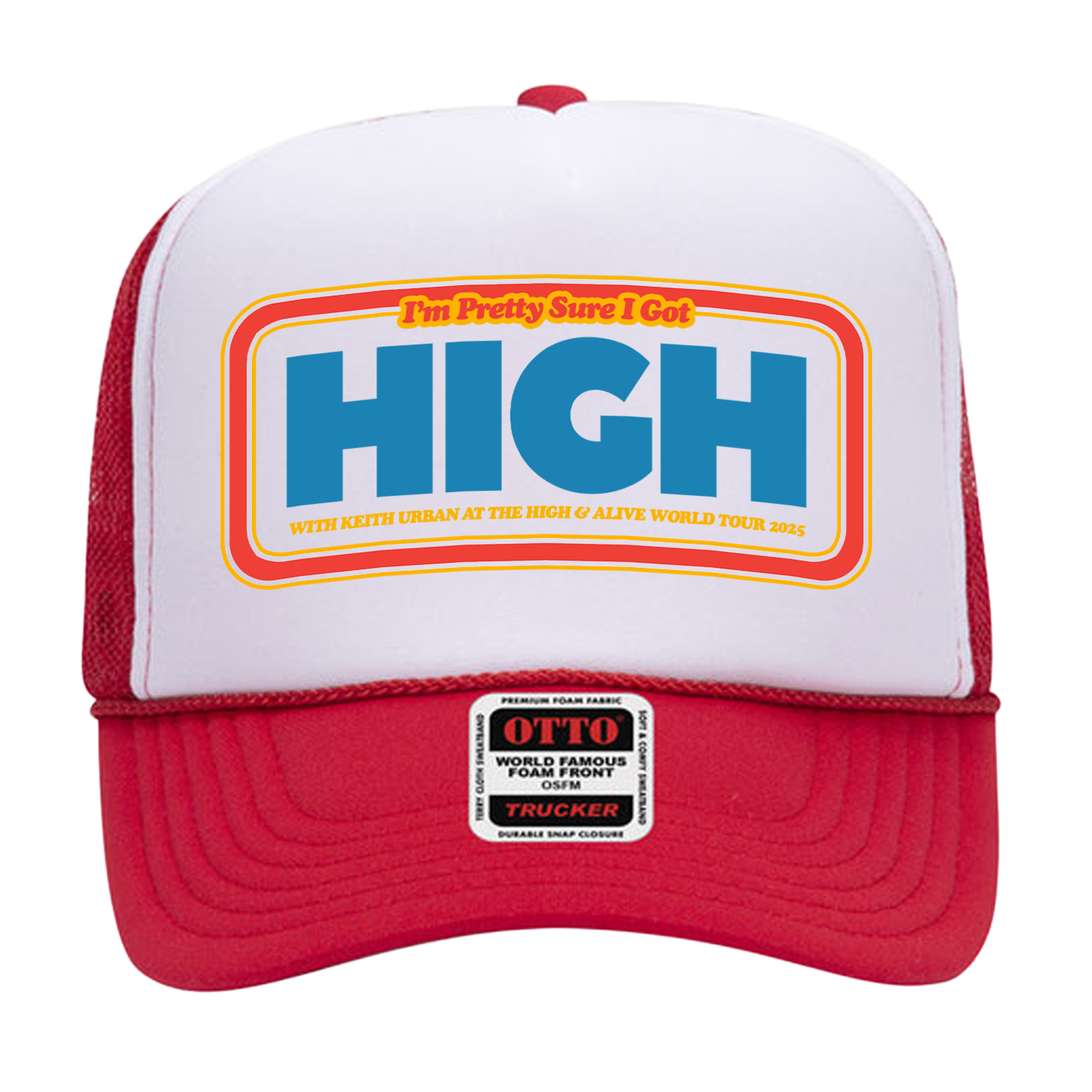 • Red mesh/White foam trucker hat featuring "I'M PRETTY SURE I GOT HIGH WITH KEITH URBAN AT THE HIGH & ALIVE WORLD TOUR 2025" on the front